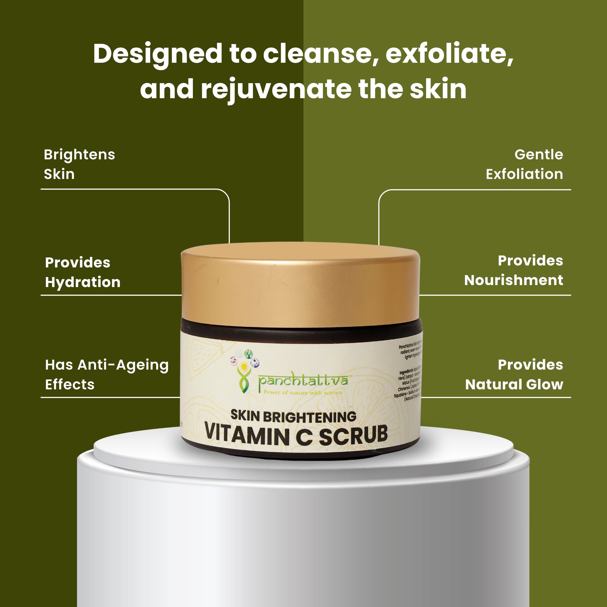 Panchatattva Skin Brightening Vitamin C Scrub gently exfoliates and buffs away dead skin cells, revealing radiant, even-toned skin. Amla, one of the richest sources of vitamin C, targets tanned skin, lightens hyperpigmentation and dark patches, and effectively combats dullness. The result is beautifully hydrated, nourished, and glowing skin. This scrub gently exfoliates and buffs dead skin cells away, revealing a radiant, even-toned skin. Amla being one of the richest sources of Vitamin C, targets tanned skin, helps lighten hyperpigmentation & dark patches and effectively combats dullness resulting in hydrated & nourished skin.