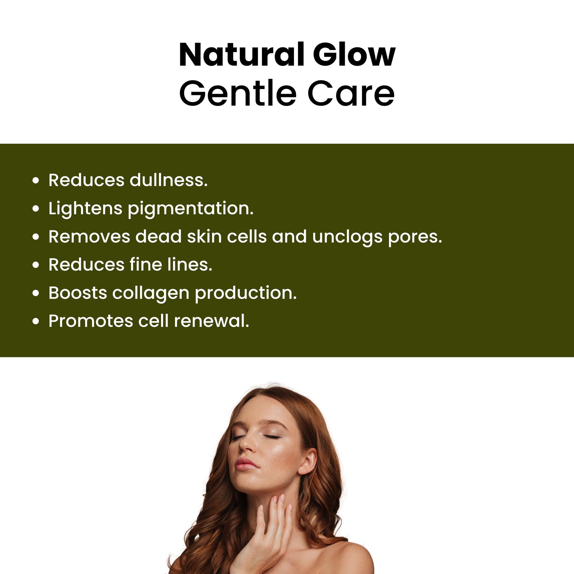 This scrub offers a perfect blend of natural exfoliation, hydration, and brightening for all skin types. Its unique combination of gentle ingredients ensures: